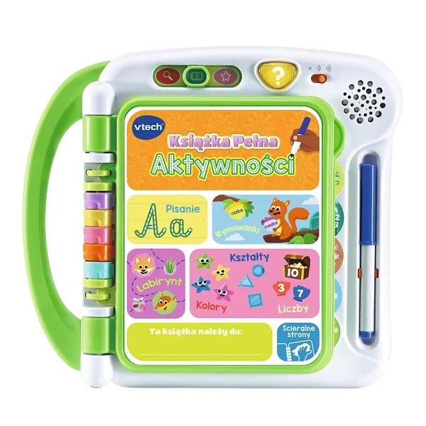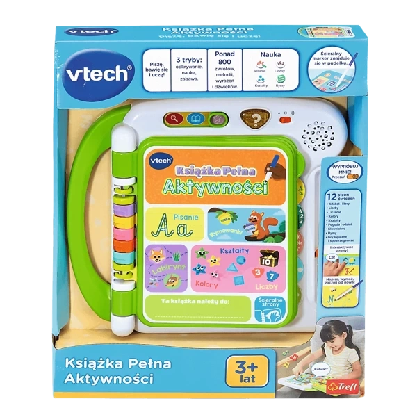 3 tryby działania: Odkrywanie, Nauka, Zabawa i różnorodne aktywności sprawiają, że nie ma czasu na nudę! Przyjemny głos narratora zachęca do rozwiązywania ćwiczeń, a Przycisk Pomoc, pozwala uzyskać wskazówkę lub ponownie usłyszeć pytanie. Ścieralny marker sprawia, że książka idealnie nadaje się do ćwiczenia pisania, a praktyczny uchwyt pozwala zabrać zabawkę ze sobą, gdzie tylko chcesz!