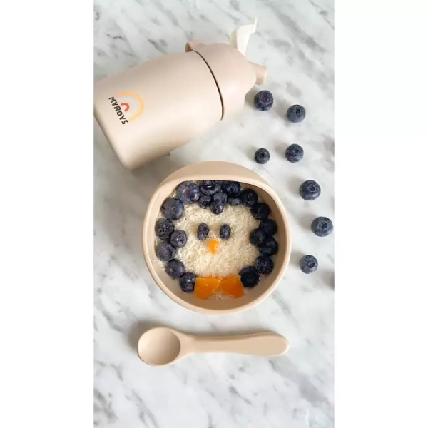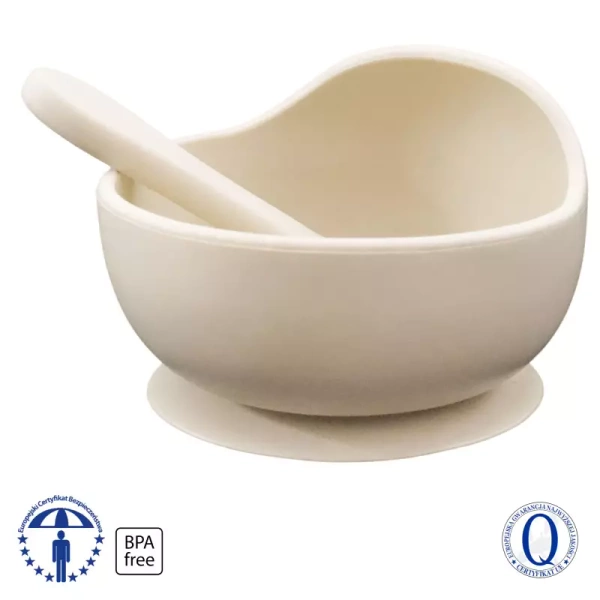 Silikonowa miseczka z łyżeczką pomaga rozwijać umiejętności motoryczne u dzieci.