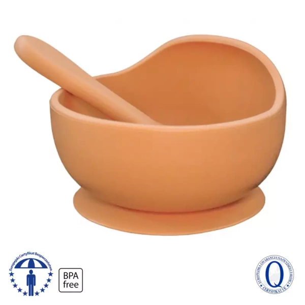 Silikonowa miseczka z łyżeczką pomaga rozwijać umiejętności motoryczne u dzieci.