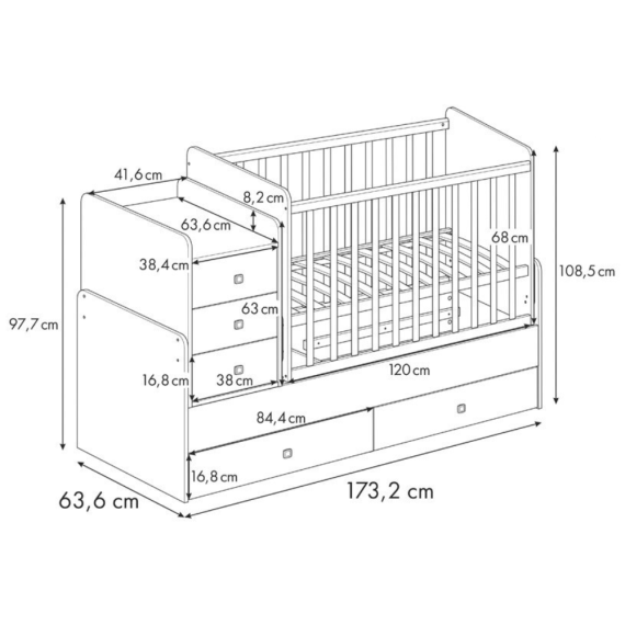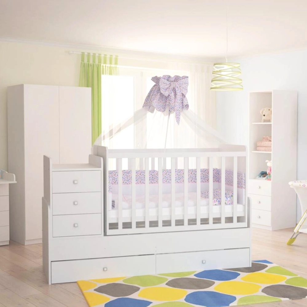 Łóżeczko niemowlęce 120×60 cm wyposażone w funkcję kołysania, która pomaga uspokoić dziecko, komodę oraz praktyczny przewijak, ułatwiający codzienną pielęgnację.