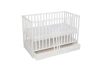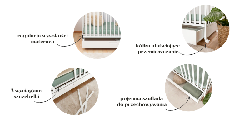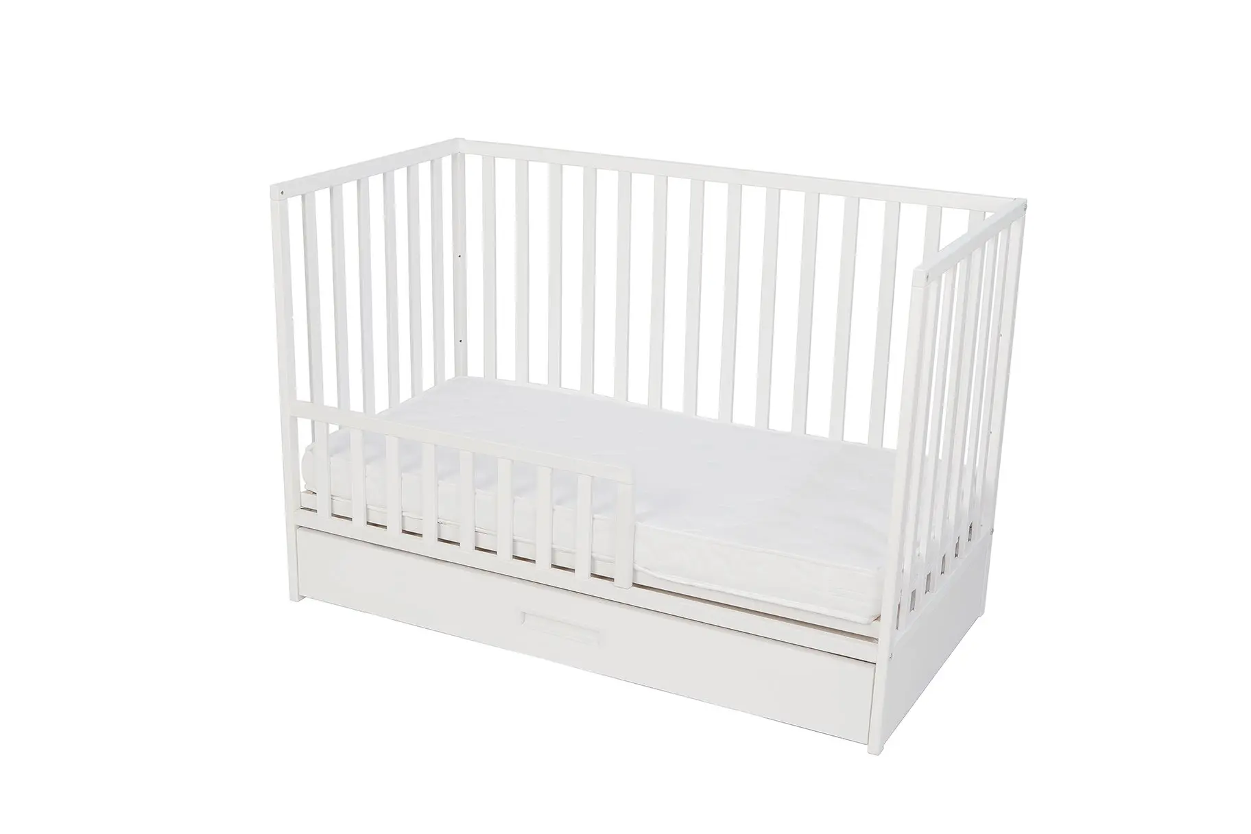 Szczebelki w łóżeczku są płaskie, lakierowane białym lakierem bezpiecznym dla dzieci i niemowląt. Łóżeczko posiada mocny, drewniany stelaż pod materac, który wykonano z twardego drewna bukowego, oszlifowany, nielakierowany. Na kolor biały pomalowano zewnętrzne listwy stelaża, widoczne pod materacem. Szuflada montowana jest na prowadnicy rolkowej. Pomocnicze 4 białe kółka posiądą hamulce. W bezpieczeństwie o zdrowie dziecka w łóżeczku nie stosujemy żadnych zaślepek aby uniknąć ich połknięcia przez dziecko.