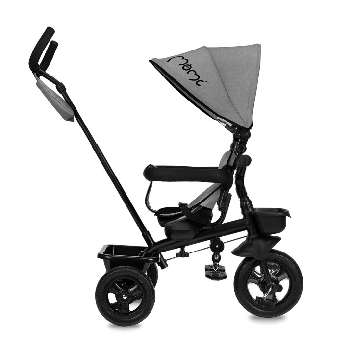 MoMi TELDE posiada regulowany daszek, obszerne siedzisko z pasami bezpieczeństwa oraz składany podnóżek. Wyposażony jest także w dwa kosze na zakupy i małą saszetkę na podręczne rzeczy.