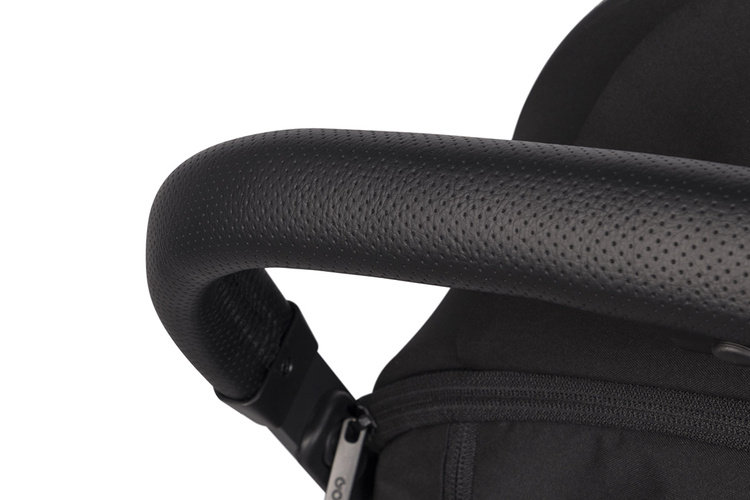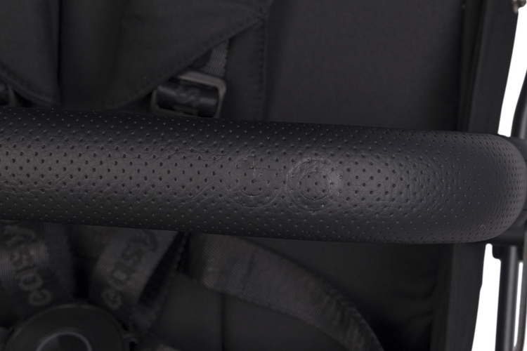 Rączka wózka i barierka zabezpieczająca dziecko zostały obszyte stylową skórą ekologiczną, która zapewnia większy komfort i pewniejszy chwyt. Skóra posiada modny wzór perforacji oraz wytłoczony logotyp, co nadaje wózkowi sportowego charakteru.