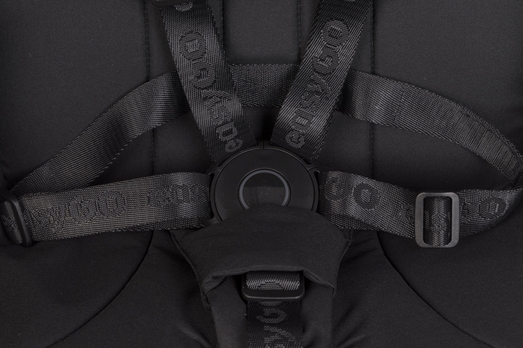 Nad bezpieczeństwem dziecka czuwają 5-punktowe pasy bezpieczeństwa z nowoczesną okrągłą centralną klamrą. Pasy wykonane zostały z taśm nośnych najwyższej jakości, więc są gładkie i nie podrażniają skóry dziecka. Dodatkowe miękkie osłonki zwiększają komfort podczas codziennych spacerów.