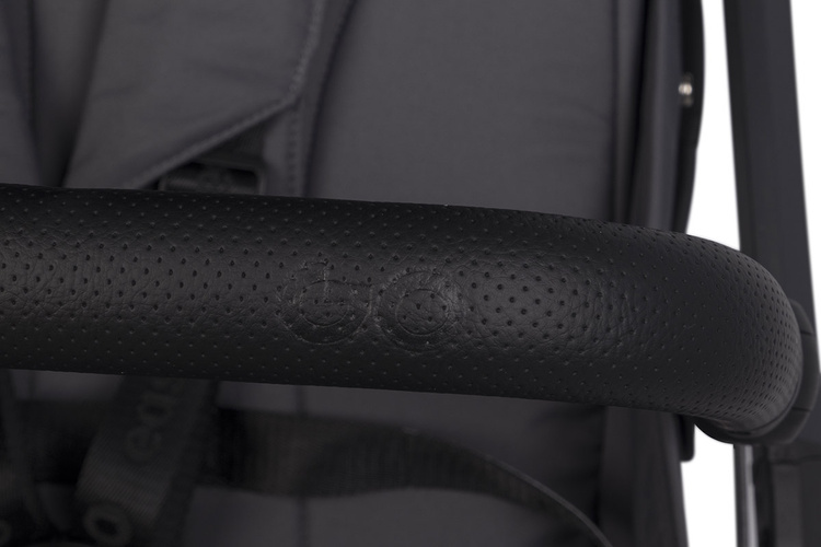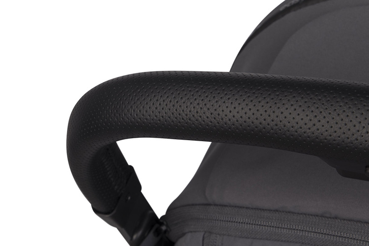 Rączka wózka i barierka zabezpieczająca dziecko zostały obszyte stylową skórą ekologiczną, która zapewnia większy komfort i pewniejszy chwyt. Skóra posiada modny wzór perforacji oraz wytłoczony logotyp, co nadaje wózkowi sportowego charakteru.