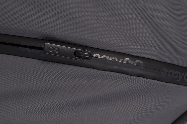 Tapicerka wózka spacerowego EASYGO HERO wykonana została z gładkich i przyjemnych w dotyku tkanin wysokiej jakości w modnych wyrazistych kolorach charakterystycznych dla stylu marki. Metalowe emblematy w kolorze czarny mat, bryzgoszczelny logowany suwak w budce oraz wykończenia z czarnej matowej skóry ekologicznej nadają wózkowi sportowego charakteru.