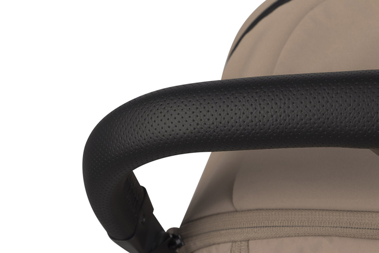 Rączka wózka i barierka zabezpieczająca dziecko zostały obszyte stylową skórą ekologiczną, która zapewnia większy komfort i pewniejszy chwyt. Skóra posiada modny wzór perforacji oraz wytłoczony logotyp, co nadaje wózkowi sportowego charakteru.