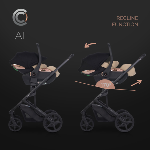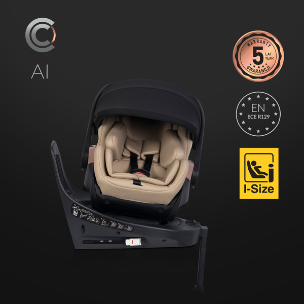 Fotelik samochodowy AI marki CAVOE posiada funkcję rozkładania do pozycji leżącej (do kąta 170°), dzięki czemu po zamontowaniu na stelażu wózka dziecięcego, może pełnić funkcję gondoli. Fotelik oferowany jest razem z obrotową bazą ISOFIX i posiada najnowszą homologację ECE R129 I-SIZE.