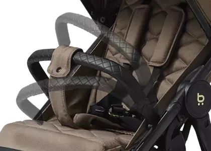 Rączka z Regulacją Wysokości: Wykonana z przyjemnej w dotyku skóry z eleganckimi przeszyciami, dostosowująca się do wzrostu rodzica.