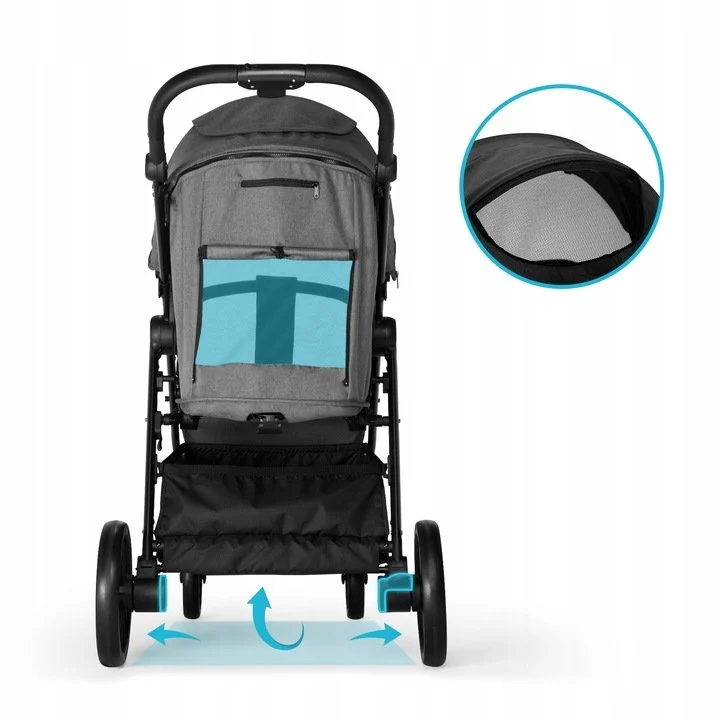Wózek został zaprojektowany z myślą o maksymalnym komforcie dziecka, dlatego posiada dużą siateczkową wentylację z tyłu oparcia oraz okienko w daszku.