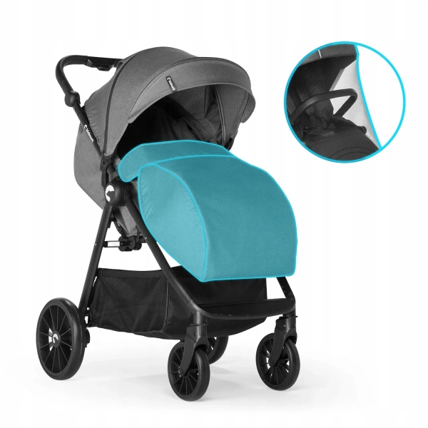 Wózek jest wyposażony w praktyczny pokrowiec na nogi, który zapewnia dziecku ciepło i ochronę przed chłodem oraz wiatrem podczas spacerów.