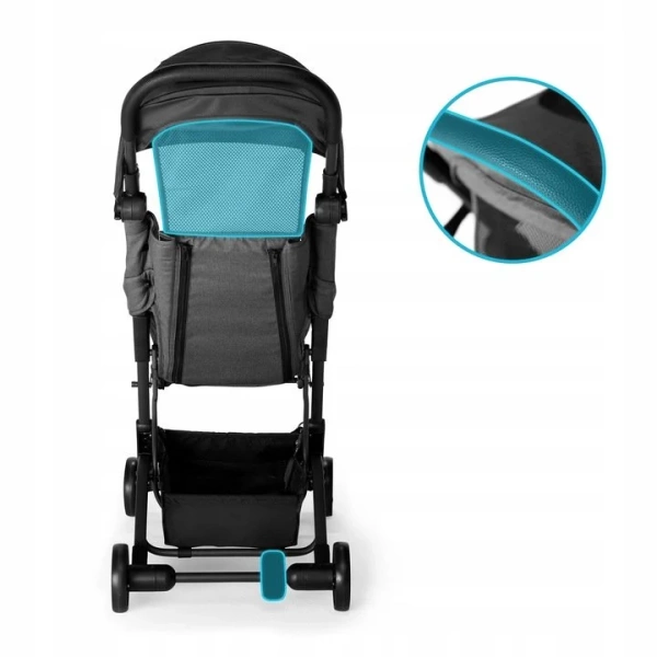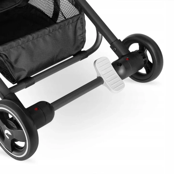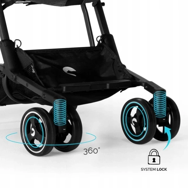 Amortyzowane koła z blokadą kierunku - wózek dziecięcy ma obracane o 360° przednie koła, które idealnie nadają się do nierównego terenu. System amortyzacji absorbuje uderzenia, a blokada kierunku zapewnia stabilność i bezpieczną jazdę w trudnych warunkach. Dzięki temu wózek dziecięcy gwarantuje delikatne i bezpieczne spacery.