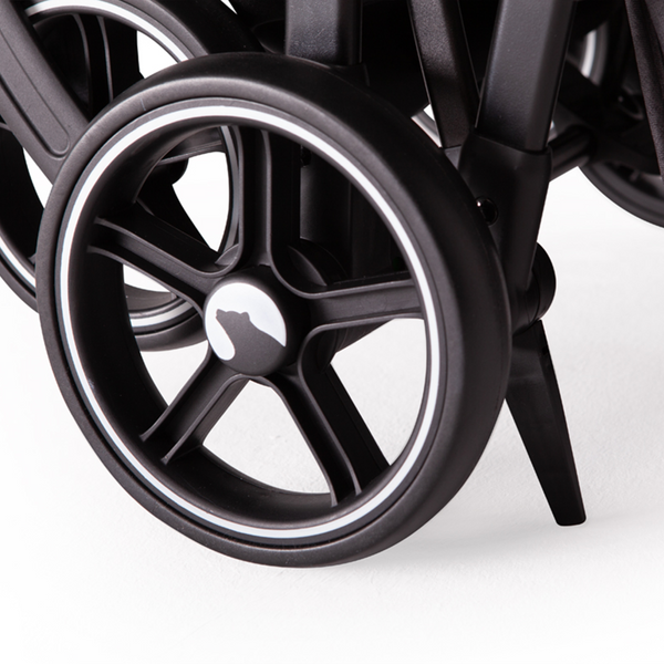 Wózek posiada amortyzację wszystkich kół, co zapewnia dziecku wysoki komfort jazdy. Miękkie, żelowe koła (przednie w rozmiarze 6", tylne 8") dodatkowo niwelują wstrząsy i nie wymagają pompowania. Dla wygodnego transportu wszystkie koła można łatwo odpiąć. Przednie koła obracają się o 360°, a w razie potrzeby możliwe jest zablokowanie kierunku ich jazdy.