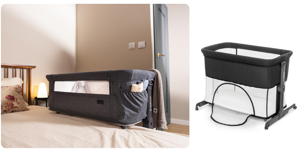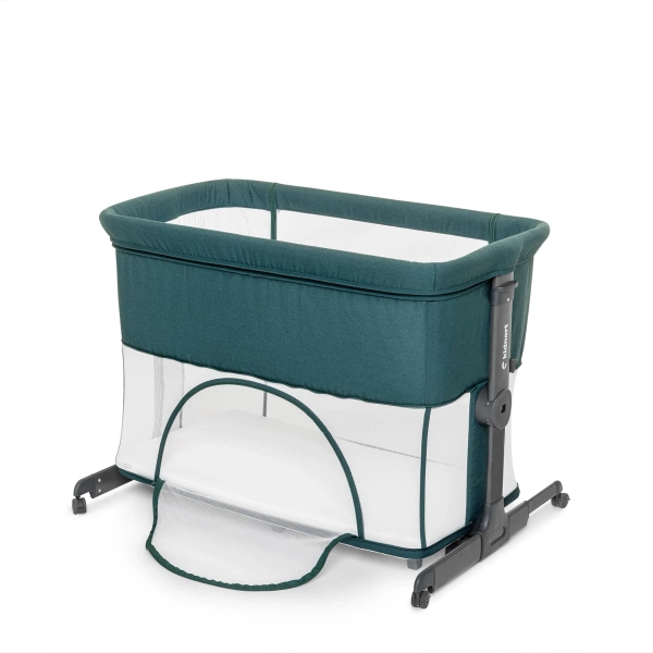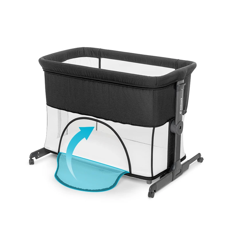 Wygodne wejście boczne ułatwiające wejście do łóżeczka. Opcja kojca umożliwia przekształcenie łóżeczka w bezpieczną przestrzeń do zabawy, dzięki bocznym ściankom i stabilnej konstrukcji.