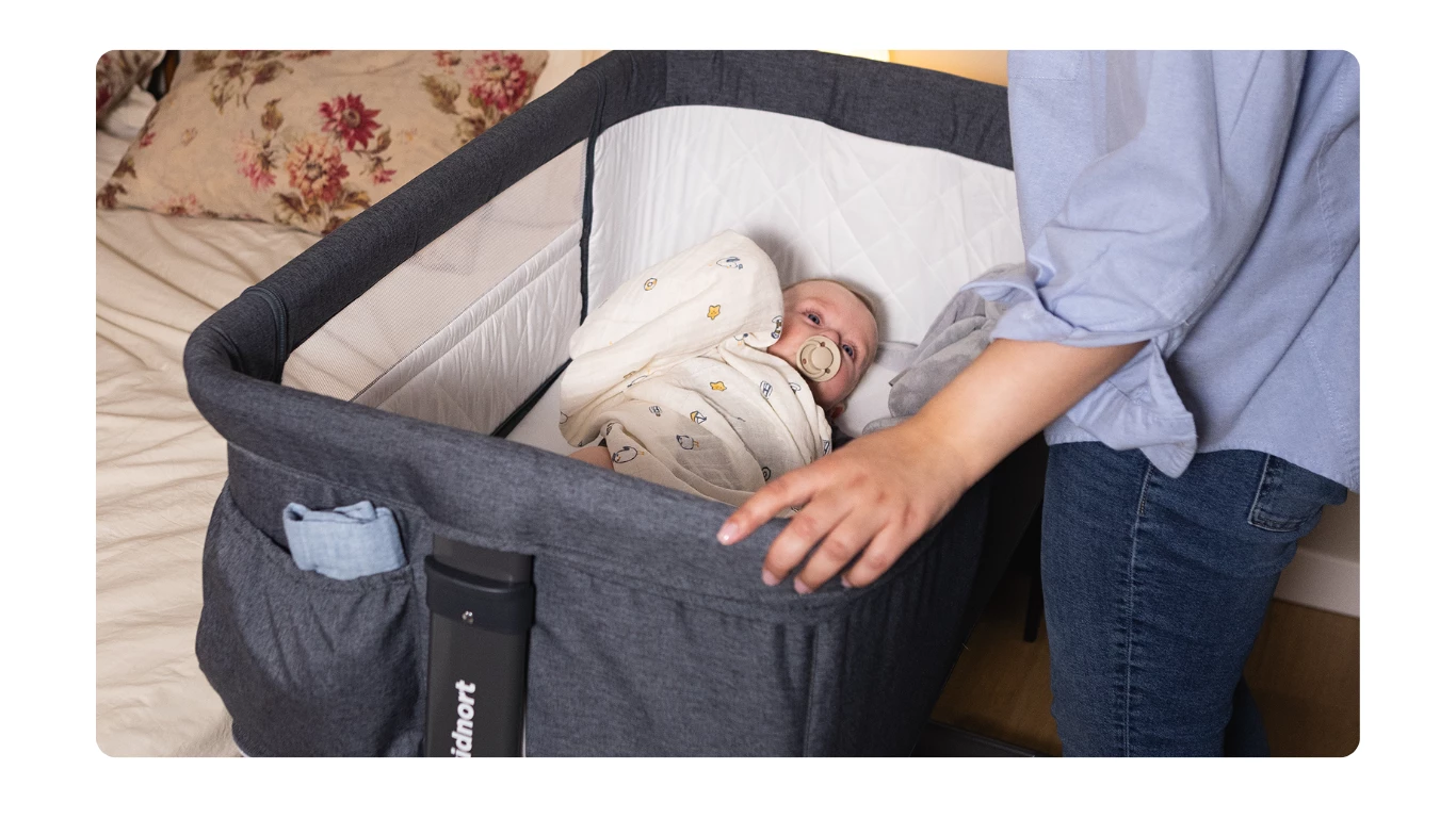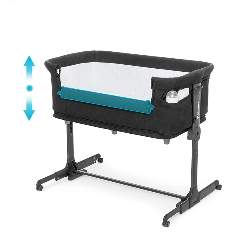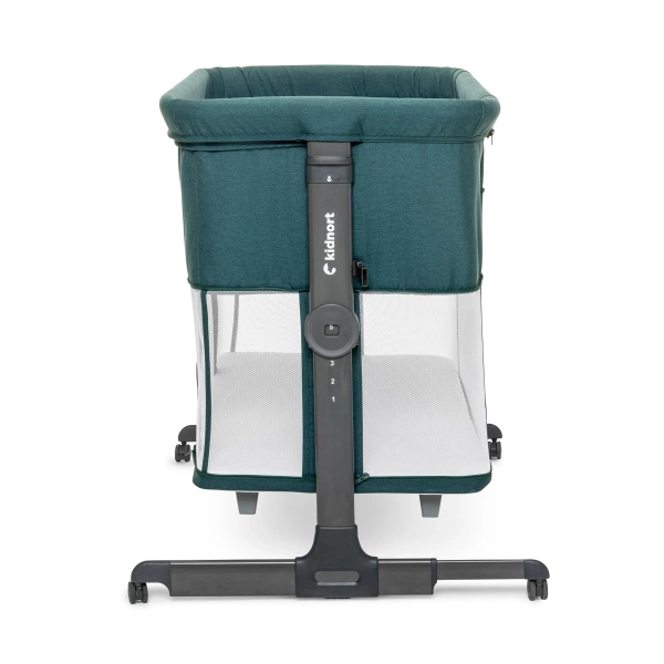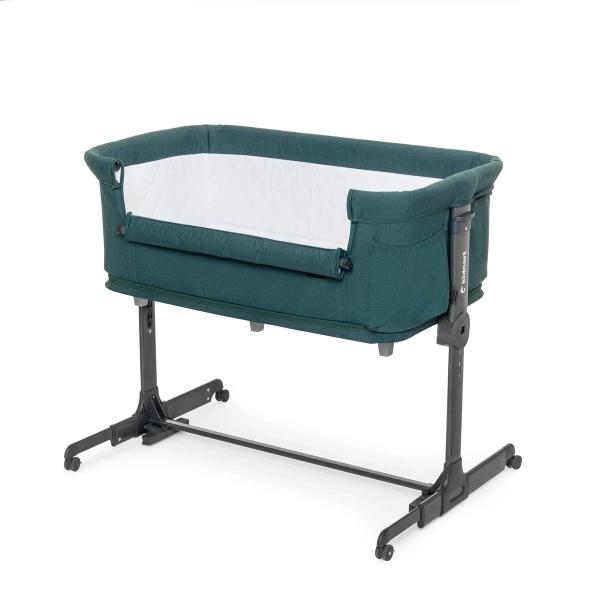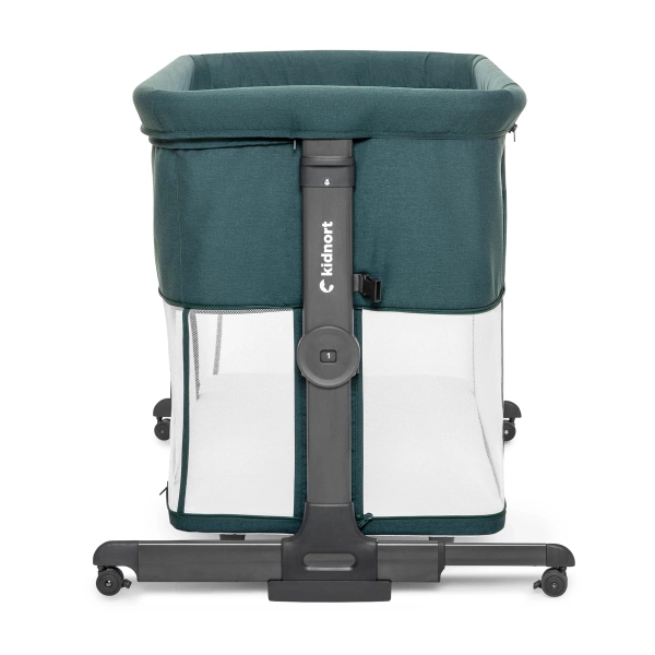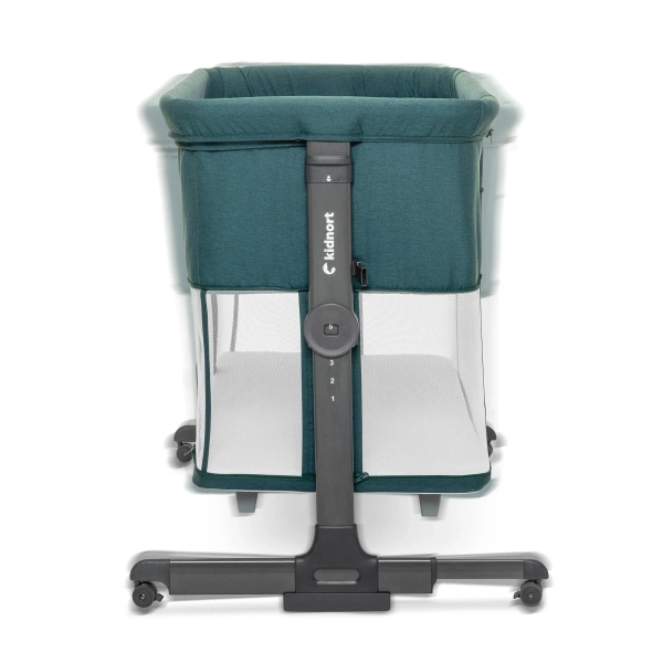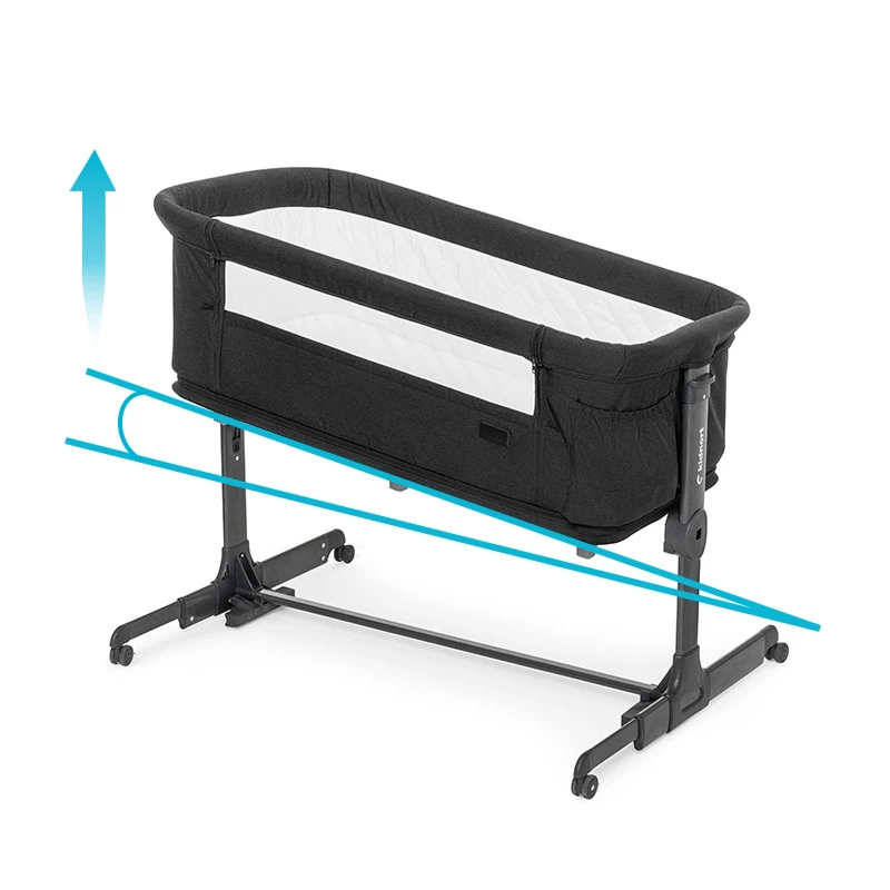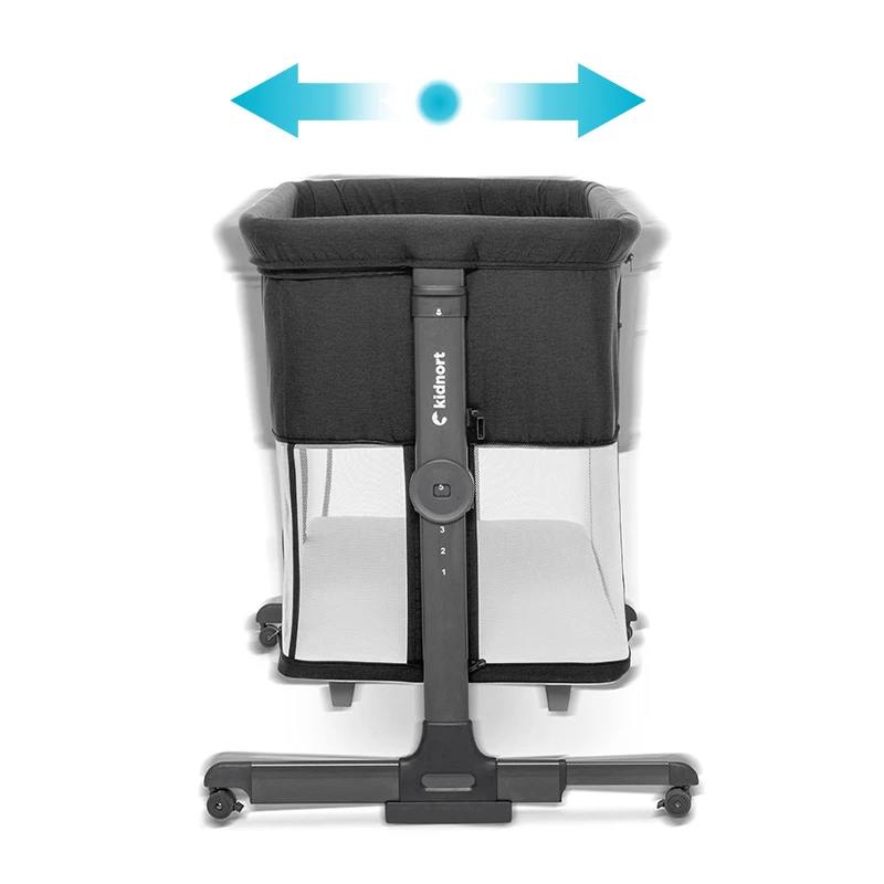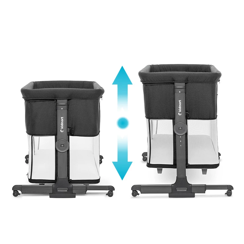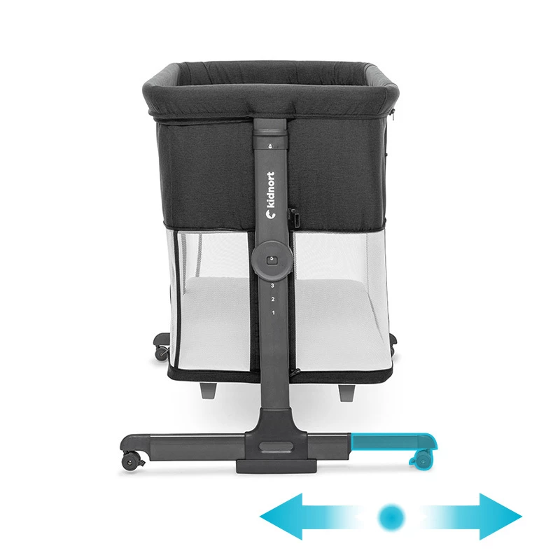 Pneumatyczne nóżki umożliwiają bliskie dosunięcie łóżeczka do łóżka rodziców, zapewniając bezpieczne połączenie. Dodatkowo 4 kółka z blokadą ułatwiają przemieszczanie łóżeczka i jego stabilne zablokowanie w wybranym miejscu, co zwiększa wygodę i funkcjonalność.