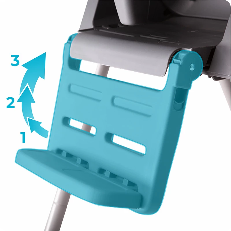 Krzesełko do karmienia umożliwia regulację podnóżka w trzech stopniach, co pozwala na idealne dopasowanie do wzrostu i wygody dziecka. Dzięki temu, maluch może siedzieć w bardziej ergonomicznej pozycji, co zwiększa komfort podczas posiłków.