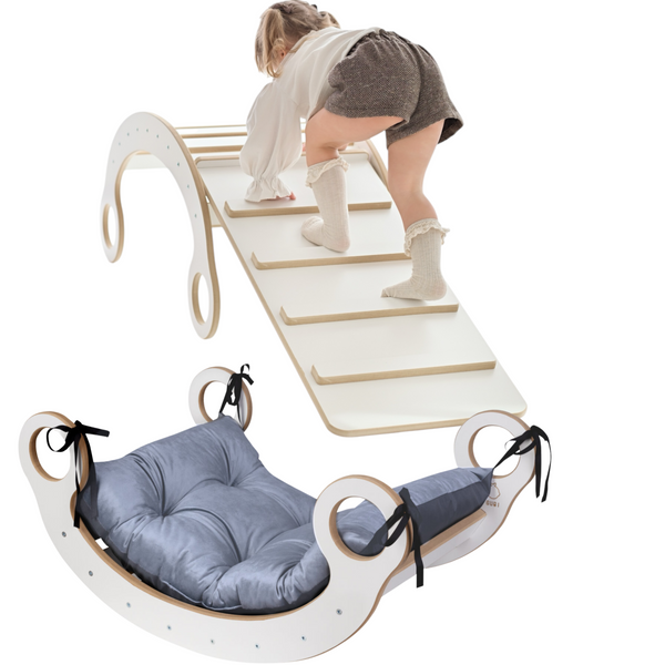 GUGI Bujak Drewniany Montessori Mały M+ Drabinka/Zjeżdżalnia + Poduszka Szara