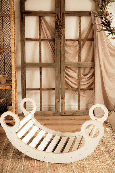 Bujak Montessori to uniwersalna zabawka dla dzieci. Bujak można wykorzystywać w dwóch ustawieniach jako bujak-huśtawka lub jako most . Zastosowań ma tyle, na ile pozwoli wyobraźnia.