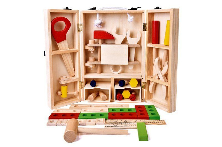Drewniana skrzynka z narzędziami dla każdego małego majsterkowicza. W zestawie znajdziemy estetyczne elementy, specjalnie przygotowane dla dzieci. Dziecko stworzy z nim różne budowle według upodobania. Świetna zabawa gwarantowana.