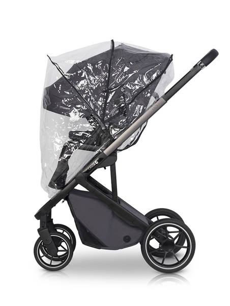 W zestawie z wózkiem w wersji spacerowej otrzymujesz pokrowiec przeciwdeszczowy, moskitierę i ocieplacz na zimę.