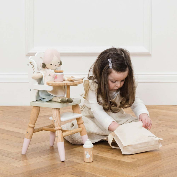 Zestaw został Wykonany z naturalnej bawełny i pięknego, certyfikowanego drewna FSC®. Wszystkie akcesoria są przystosowane do lalek i pluszaków o wymiarach około 30-35 cm.