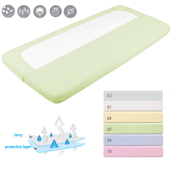 Nieprzemakalne i oddychające prześcieradło frotte Wierzchnia warstwa wykonana jest z miękkiej tkaniny frotte zapobiegającej podrażnieniom skóry, natomiast spodnia warstwa prześcieradła, wykonana jest z oddychającej membrany poliuretanowej. Nie przepuszcza płynów, chroniąc materac przed zmoczeniem. Dostępne w dwóch rozmiarach. Skład: 82% cotton, 18% polyester