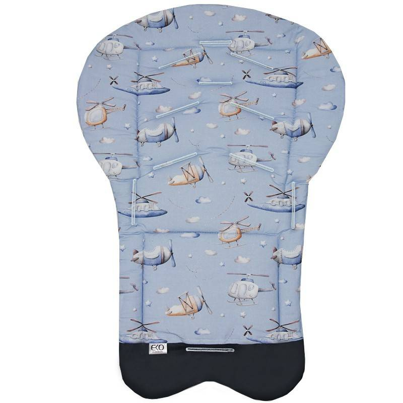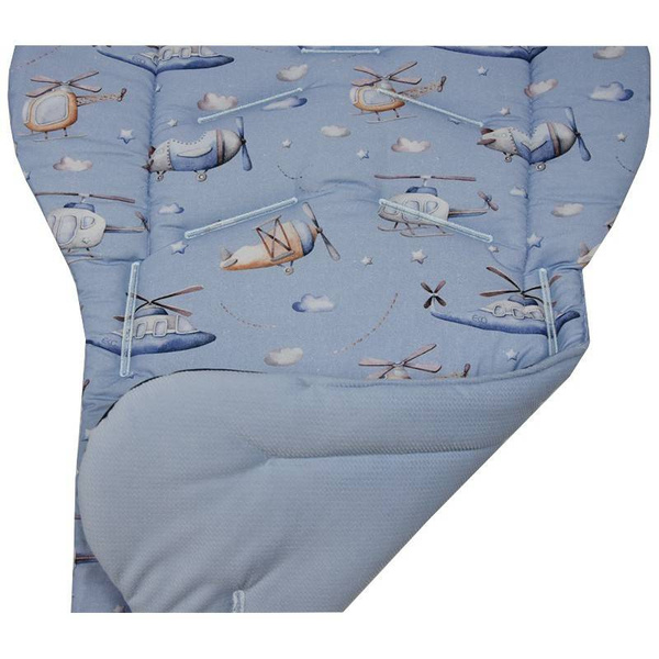 Zwiększa komfort podróżowania po nierównościach. Może być użytkowana obustronnie. Wkładka ma uniwersalne zastosowanie w każdym wózku spacerowym. Świetnie dopasowuje się do wózka i dziecka. Ze względu na różne szerokości pasów zabezpieczających w wózkach otwory są zaszyte. Żeby dostosować produkt do wózka, należy przeciąć otwory w odpowiednich wyhaftowanych punktach.