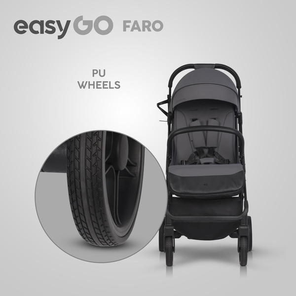 Spacerówka EASYGO FARO posiada bardzo dobrą amortyzację sprężynową i koła z wysokiej jakości oponami wykonanymi z elastomeru poliuretanowego (koła żelowe). Koła z poliuretanu zapewniają świetną przyczepność i amortyzację, a jednocześnie są lekkie i odporne na zużycie. Stosowane są zazwyczaj w dużo droższych wózkach dziecięcych dostępnych na rynku.