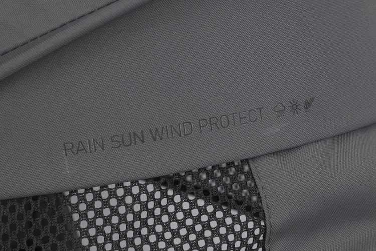 Budka przeciwsłoneczna posiada cichy system regulacji oraz dodatkową rozkładaną sekcję, która umożliwia osłonięcie dziecka przed nisko operującym słońcem. W tylnej części budki znajduje się okienko do podglądania dziecka oraz duży otwierany panel wentylacyjny z siateczką.
