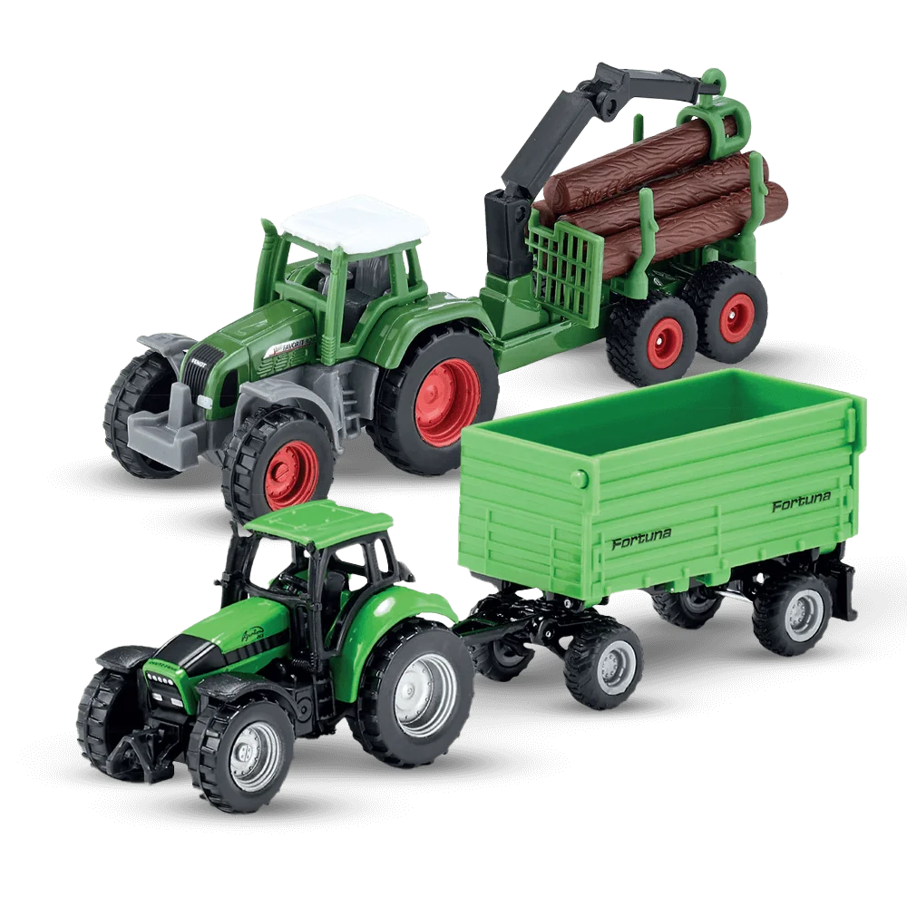 Zestaw pojazdów rolniczych Siku to 2 modele reprezentujące pojazdy używane do prac rolnych: traktor z przyczepą do przewozu drewna oraz ciągnik Deutz-Fahr z 2-osiową przyczepą Fortuna.