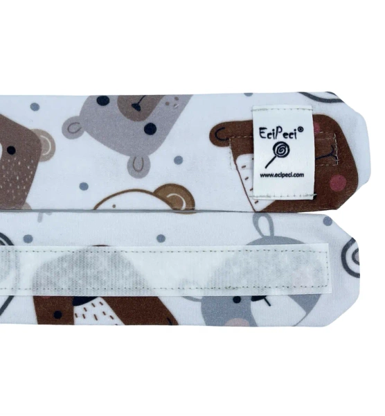 Opaska wykonana jest z najwyższej jakości atestowanych materiałów (dzianina zgodna z Oeko-Tex® Standard 100). Opaska zapinana jest na rzep VELCRO – najdelikatniejszy z rzepów dostępnych na rynku, dedykowany specjalnie dla produktów dziecięcych.