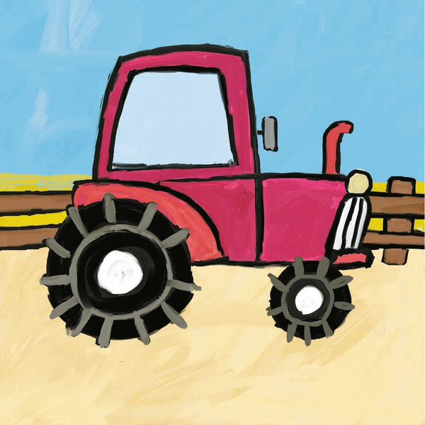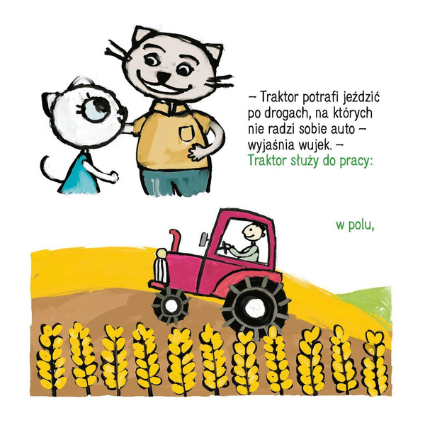 Zachwyca się traktorem, który wujek kupił do pracy w sadzie.