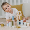 Ponadczasowe drewniane klocki mają pastelowe kolory i różne kształty, które pobudzają wyobraźnię dziecka, rozwijają jego koordynację ruchową i uczą ich rozpoznawania. Wspomagają rozwój kreatywności, zdolności poznawczych i manualnych nawet najmłodszych dzieci.