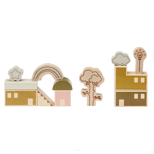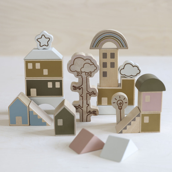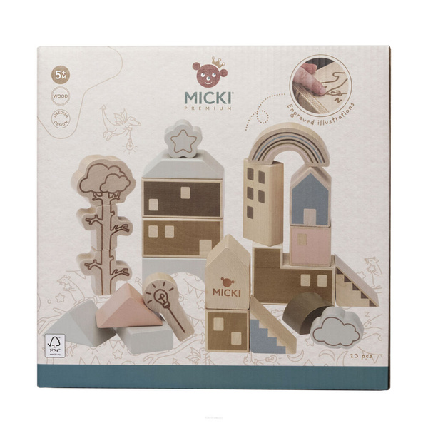 Buduj, odkrywaj i baw się drewnianymi klockami szwedzkiej marki Micki! Zestaw Miasto z serii Premium zawiera wszystko, co potrzebne aby zbudować własne niepowtarzalne miasto lub osiedle. Są tu różne klocki domki, schody, elementy infrastruktury, a nawet tęcza, chmurka i latarnia! Klocki mają pastelowe kolory i wygrawerowane detale, dzięki którym dziecko może nie tylko zobaczyć, ale również poczuć daną ilustrację, a ich fantazyjne kształty pobudzają wyobraźnię dziecka, rozwijają jego koordynację ruchową i uczą ich rozpoznawania. Wspomagają rozwój kreatywności, zdolności poznawczych i manualnych nawet najmłodszych dzieci. Zapakowane w zestaw 23 sztuk oferują nieskończone możliwości zabawy. Z klockami Micki ciekawość, eksplorowanie świata i wyobraźnia Twojego dziecka nie znają granic!