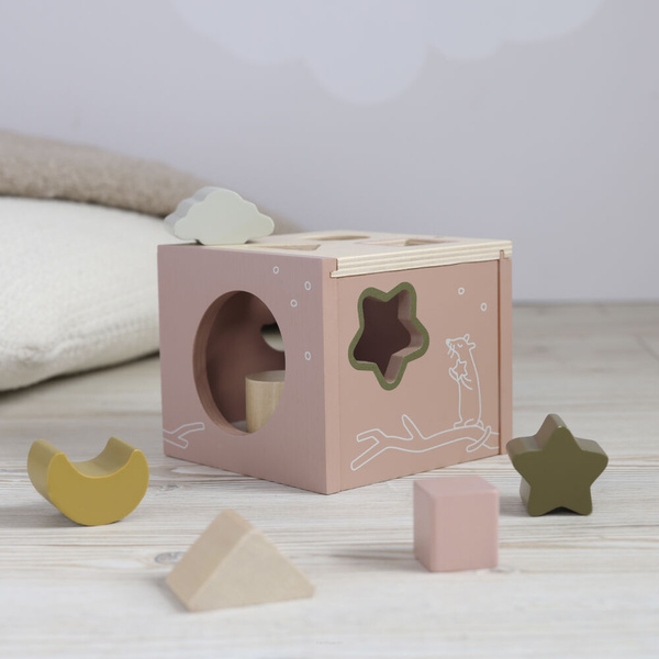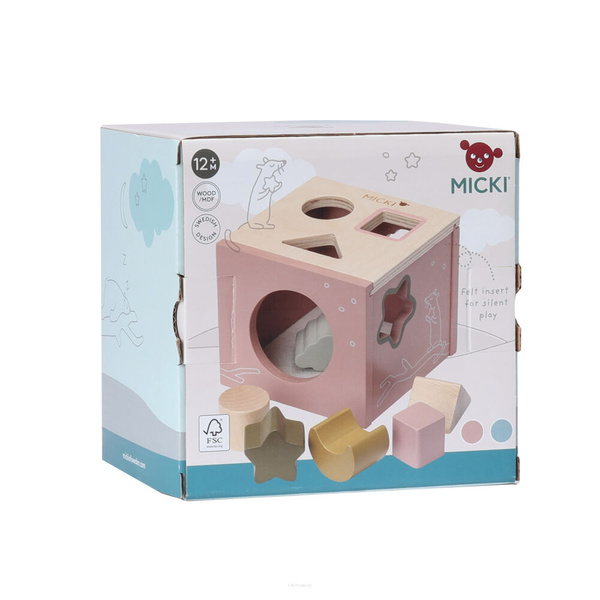 Dopasuj kształt klocka do kształtu na ściance sortera, aby wrzucić go do środka! Klasyczna drewniana zabawka szwedzkiej marki Micki - różowy sorter kształtów bawi, rozwija i uczy Twoje dziecko. Otwory sortera są idealnie dopasowane do kształtu uroczych drewnianych klocków, więc dziecko ma dużą frajdę z wrzucania ich do środka. Gdy klocki są już w pudełku, wystarczy wyjąć je przez otwór w tylnej ściance i zacząć zabawę od nowa.Dno pudełka jest pokryte filcem, dzięki czemu każdy wrzucony klocek wydaje przyjemny dla małych uszu dźwięk, co wzbogaca sensoryczne doświadczenie z interakcji z sorterem. Sorter kształtów zawiera 6 drewnianych klocków w pastelowych kolorach w kształcie chmurki, księżyca, gwiazdki, koła, trójkąta i kwadratu. Pudełko jest ozdobione fantazyjnymi ilustracjami, które pozytywnie wpływają na wyobraźnię malucha i zapewniają jeszcze więcej przyjemności z zabawy.