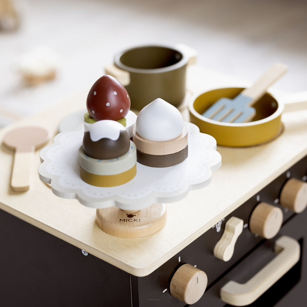 Gotowanie czas zacząć! Z tym zestaw drewnianych akcesoriów kuchennych marki Micki nie może się nie udać! Zestaw zawiera 5 niezbędnych w każdej kuchni elementów: garnek z pokrywką, patelnię, chochlę i łopatkę. Na dnie garnka i patelni skrywa się ilustracja - niespodzianka. Dzięki tej zabawce maluch ćwiczy moc kreacji, swoją wyobraźnię, zdolności manualne i koordynację ruchową - a wszystko to stylowo i ze smakiem. Z takim zestawem każde danie przygotowane przez Twoje dziecko to uczta dla podniebienia!