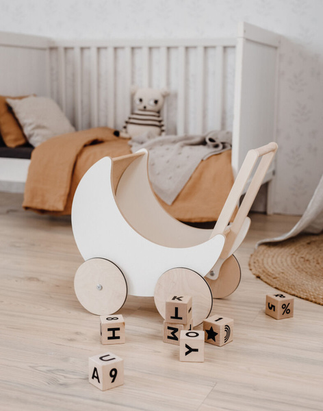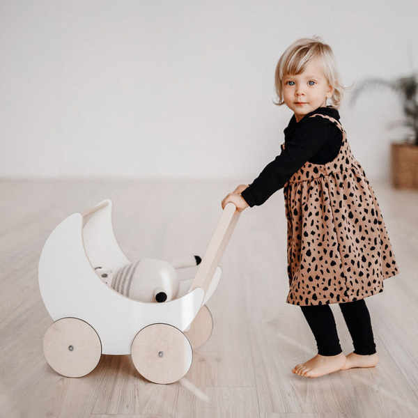 Biały drewniany wózek dla lalek marki ooh noo w kształcie księżyca to nie tylko urocza zabawka, ale także przepiękny element dekoracyjny wnętrza, który zapewni długie i kreatywne scenariusze zabawy z lalkami. Wykonany z wysokiej jakości drewna, jest trwały i bezpieczny, a specjalnie zaprojektowane koła sprawiają, że gładko sunie po powierzchniach zapewniając jeszcze więcej radości z zabawy.
