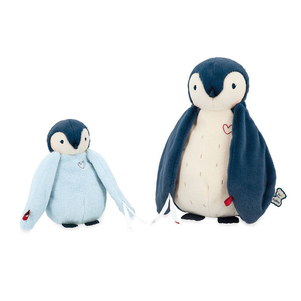 Zestaw dwóch przeuroczych przytulanek Pingwinków z kolekcji Complices francuskiej marki KALOO to idealni pierwsi przyjaciele Twojego maluszka, które przy okazji niosą ważne przesłanie na temat bliskich więzi. Pingwinki – rodzic i dziecko – są miękkie, piękne, perfekcyjnie wykończone i przede wszystkim całkowicie bezpieczne dla dziecka już od pierwszych dni jego życia. Uszyte są z dwóch rodzajów przyjemnych w dotyku tkanin w odcieniach bieli i koloru niebieskiego: futerka i aksamitnego sztruksu. Posiada także filcowe nóżki dodatkowo stymulujące zmysł dotyku. Większy pingwinek posiada długie skrzydła, którymi może obejmować mniejszego, a ponadto obie przytulanki można związać ze sobą uroczymi tasiemkami z wyhaftowanym serduszkiem – symbolem bliskości. Stworzone do tulenia, usypiania, uspokajania, zabierania na spacery i na dłuższe wyprawy mają ułatwiać maleństwu okresy separacji z rodzicem i wspierać go w budowaniu bezpiecznych więzi.