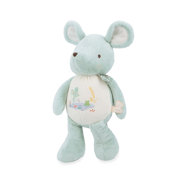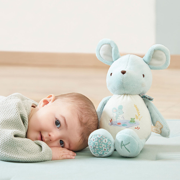 Urocza sensoryczna przytulanka Myszka z kolekcji Petites Chansons francuskiej marki KALOO to idealna zabawka dla Twojego dziecka, bezpieczna już od pierwszych dni życia. Jest mięciutka, piękna i perfekcyjnie wykończona. Myszka ma poręczne rozmiary – 28 cm wysokości, delikatne futerko w miętowym kolorze, duże uszy i łapki do chwytania, a w jej brzuszku ukryty jest dzwoneczek, który dzwoni przy potrząsaniu, stymulując zmysł słuchu maluszka. Dodatkowo jest na nim wyhaftowana opowieść o przygodach zielonej myszki.