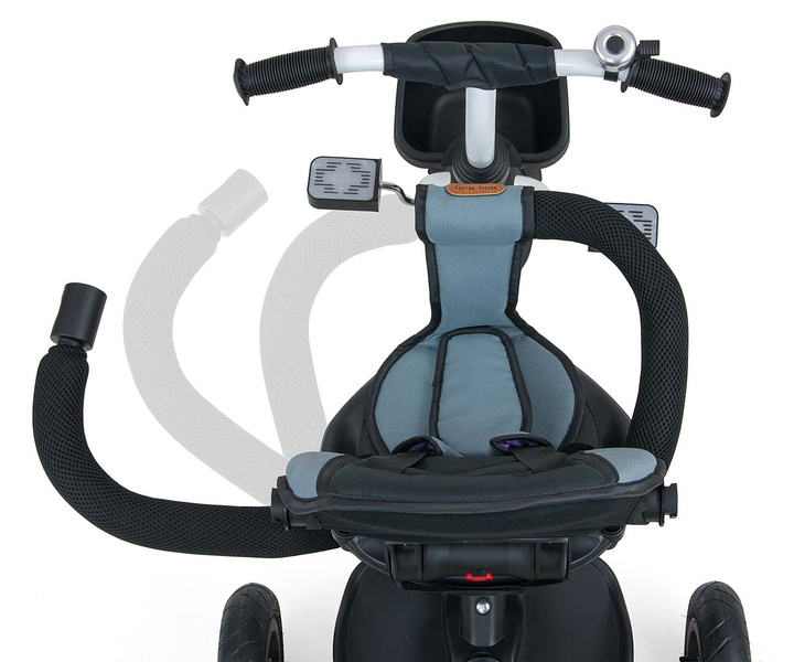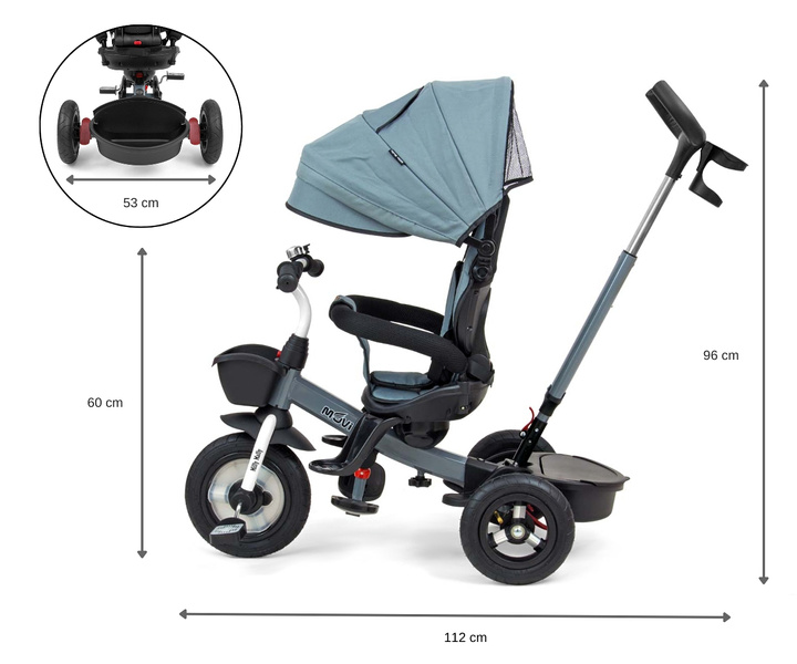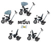 MOVI jest stabilny i bezpieczny, posiada nowoczesną konstrukcję, wygodne wyprofilowane obracane o 360 stopni siedzisko, które umożliwi podróż przodem lub tyłem do kierunku jazdy. Rowerek został wyposażony w barierkę zabezpieczająca dziecko przed wypadnięciem, trzypunktowe pasy bezpieczeństwa oraz podnóżki a pompowane koła umożliwiają cichą i komfortową jazdę. Po zdemontowaniu rączki, barierek, budki i pokrowca na siedzisko MOVI będzie służył jako rowerek trójkołowy. Dzięki funkcji „wolnego koła” dziecko może swobodnie pedałować, a kierownica dla rodzica nadal może korygować prędkość przemieszczania.