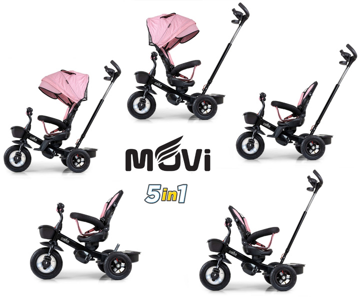 MOVI jest stabilny i bezpieczny, posiada nowoczesną konstrukcję, wygodne wyprofilowane obracane o 360 stopni siedzisko, które umożliwi podróż przodem lub tyłem do kierunku jazdy. Rowerek został wyposażony w barierkę zabezpieczająca dziecko przed wypadnięciem, trzypunktowe pasy bezpieczeństwa oraz podnóżki a pompowane koła umożliwiają cichą i komfortową jazdę. Po zdemontowaniu rączki, barierek, budki i pokrowca na siedzisko MOVI będzie służył jako rowerek trójkołowy. Dzięki funkcji „wolnego koła” dziecko może swobodnie pedałować, a kierownica dla rodzica nadal może korygować prędkość przemieszczania.