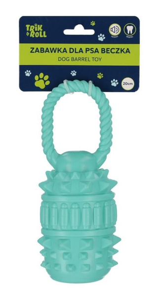 Zalety produktu jest to zabawka dla psa w formie beczki z uchwytem, zaprojektowana z myślą o interaktywnych zabawach, takich jak aportowanie czy przeciąganie. Zabawka posiada uchwyt ułatwiający rzucanie i przeciąganie. Jest to idealna zabawka dla psów, które lubią przeciąganie i gryzienie, a jednocześnie potrzebują bezpiecznego i miękkiego materiału dla zębów. Beczka posiada kolce oraz podczas gryzienia wydaje piszczące odgłosy. Wykonana z wytrzymałej gumy, jest odpowiednia dla psów o różnej wielkości. Zabawka w kolorze jasno niebieskim. Wymiary/waga wymiary produktu szer. x wys. x gł. . cm 8x20x8, wymiary produktu z opakowaniem szer. x wys. x gł. cm 12x26x8 cm,,waga produktu kg 0,14 kg. Zabawka pakowana w euro zawieszkę. Rekomendowana dla wszystkich ras psów.