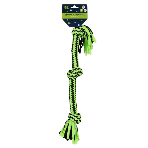 Zalety produktu Ten szarpak jest wyjątkowo mocny i trwały, co sprawia, że może posłużyć przez długi czas nawet przy intensywnej zabawie. Jest to idealna zabawka dla psów, które lubią przeciąganie i gryzienie, a jednocześnie potrzebują bezpiecznego i miękkiego materiału dla zębów. Zabawka idealna do przeciągania, aportowania oraz jako gryzak. Szarpak nie posiada piszczałki oraz jakichkolwiek zapachów, możliwość prania w 30 stopniach C. Zabawka wykonana jest z ciasno plecionego sznurka z supłami, 100 bawełna. Szarpak w kolorze czarno-zielonym. Wymiary/waga wymiary produktu dł. cm 50 cm, waga produktu kg 0,18 kg. Wymiary produktu z opakowaniem szer. x wys. cm 52x10cm. Zabawka pakowana w euro zawieszkę. Rekomendowana dla średnich i dużych ras psów.