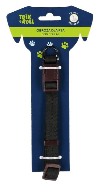 Zalety produktu Obroża posiada regulację szerokości dzięki czemu umożliwia dopasowanie obroży do szyi psa. Zapięcie typu klik ułatwia zakładanie i zdejmowanie obroży. Wykonana z delikatnych dla pupila materiałów. Obroża w czarnym kolorze z brązowym zatrzaskiem. Wymiary/waga wymiary produktu dł. x szer. cm od 25,6 do 43 x 1,5, Wymiary produktu z opakowaniem szer. x wys. cm 11x24cm, waga produktu kg 0,03 kg. Obroża pakowana na blistrze z euro zawieszką. Rekomendowana dla wszystkich ras psów.
