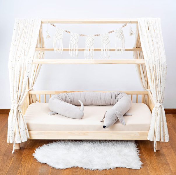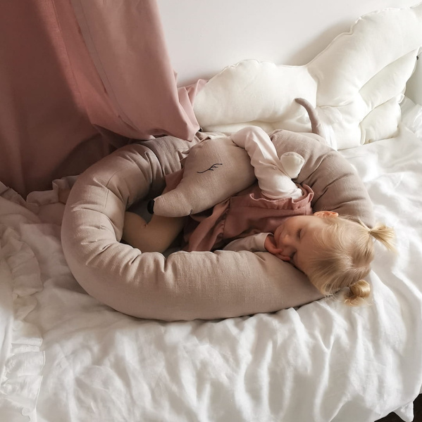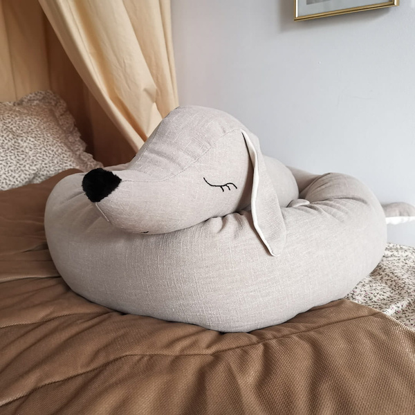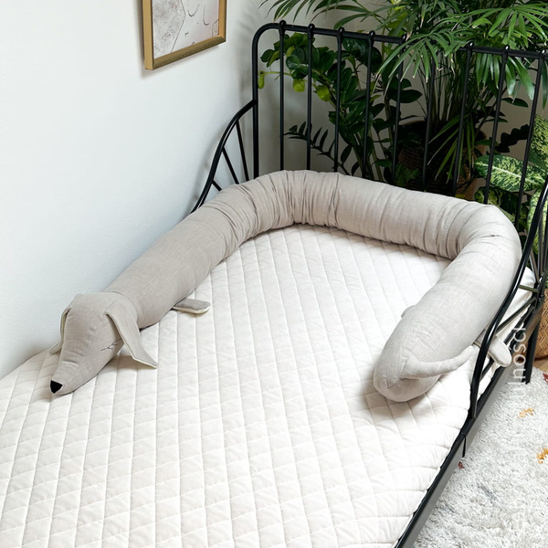 Jamnik ma długość ok 200 cm i obwód 45 cm- nie zajmuje dużo miejsca w łóżeczku. Warstwa zewnętrzna to 100% len (stonewashed- czyli tkanina prana i dodatkowo zmiękczana) gramatura 250 gr/m2, jamnik wypełniony jest antyalergicznym certyfikowanym włóknem silikonowym. Oczy i buzia są wyhaftowane ręcznie.