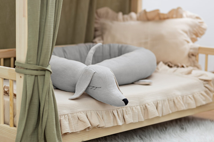 Lniany ochraniacz do łóżeczka dla dziecka jamnik w kolorze musztardowym