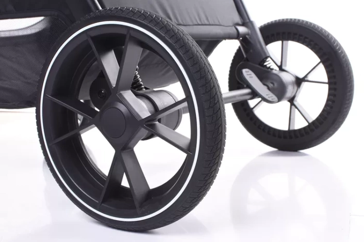 Model Foster wyposażono w amortyzację z przodu i z tyłu, co zapewnia płynne prowadzenie nawet na nierównych nawierzchniach. Duże koła pokryte gumową powłoką nie wymagają obsługi, a ich doskonała przyczepność i zwrotność ułatwiają prowadzenie wózka w każdej sytuacji. Przednie koła obracają się o 360 stopni i mogą zostać zablokowane, co daje pełną kontrolę nad manewrowaniem.