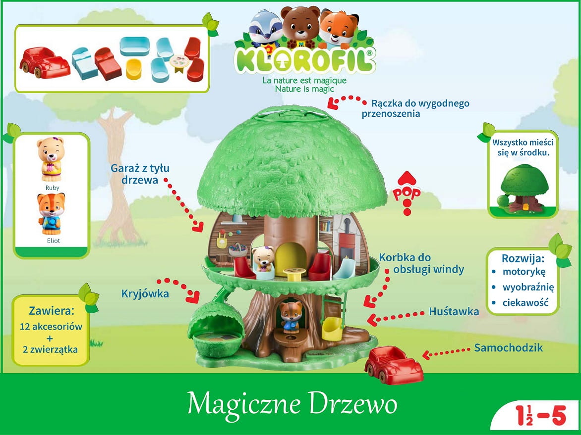 Każdego ranka słońce wstaje w magicznym świecie Klorofilu, w którym urocze zwierzątka żyją w harmonii z naturą. Najlepsze miejsce na relaks i zabawę to Magiczne Drzewo. Naciśnij przycisk na szczycie korony drzewa i POP - drzewo otwiera się ukazując ukryty w liściach drzewa przytulny dom.