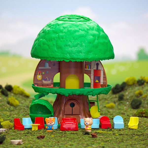 Zawiera domek drzewo, 2 zwierzątka, samochód, miejsce do odpoczynku, huśtawka, 2 łóżka, stół, 4 krzesła, ławkę, fotel, naklejki.