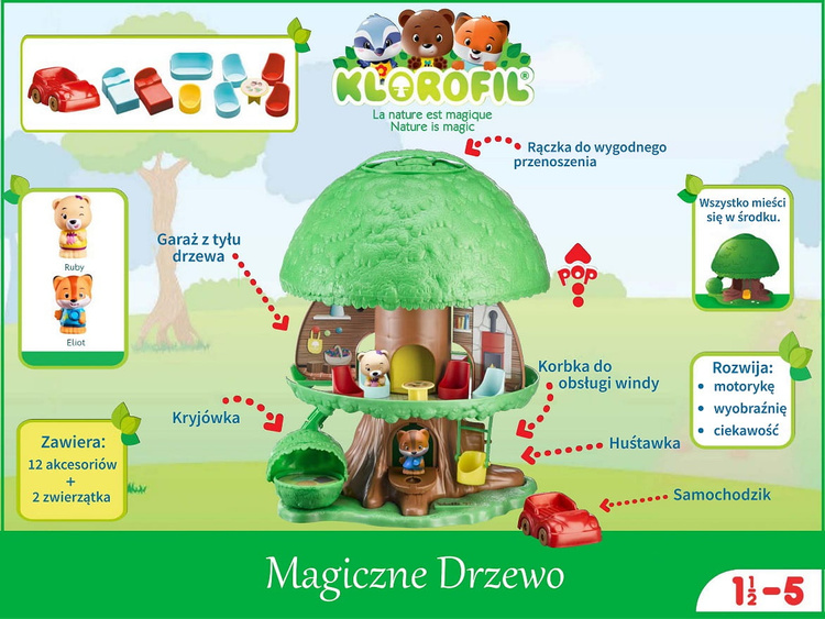 Nowość od producenta Żyrafki Sophie, zestaw Klorofil Magiczne Drzewo zawiera: drzewo domek, 2 zwierzątka, samochodzik, 2 łóżeczka, stolik, 4 krzesła, kanapa, fotel. Montaż zabawki wymagany jest przez osobę dorosłą. Opakowanie zawiera instrukcję. Zabawka dla dzieci w wieku 18 miesięcy +.